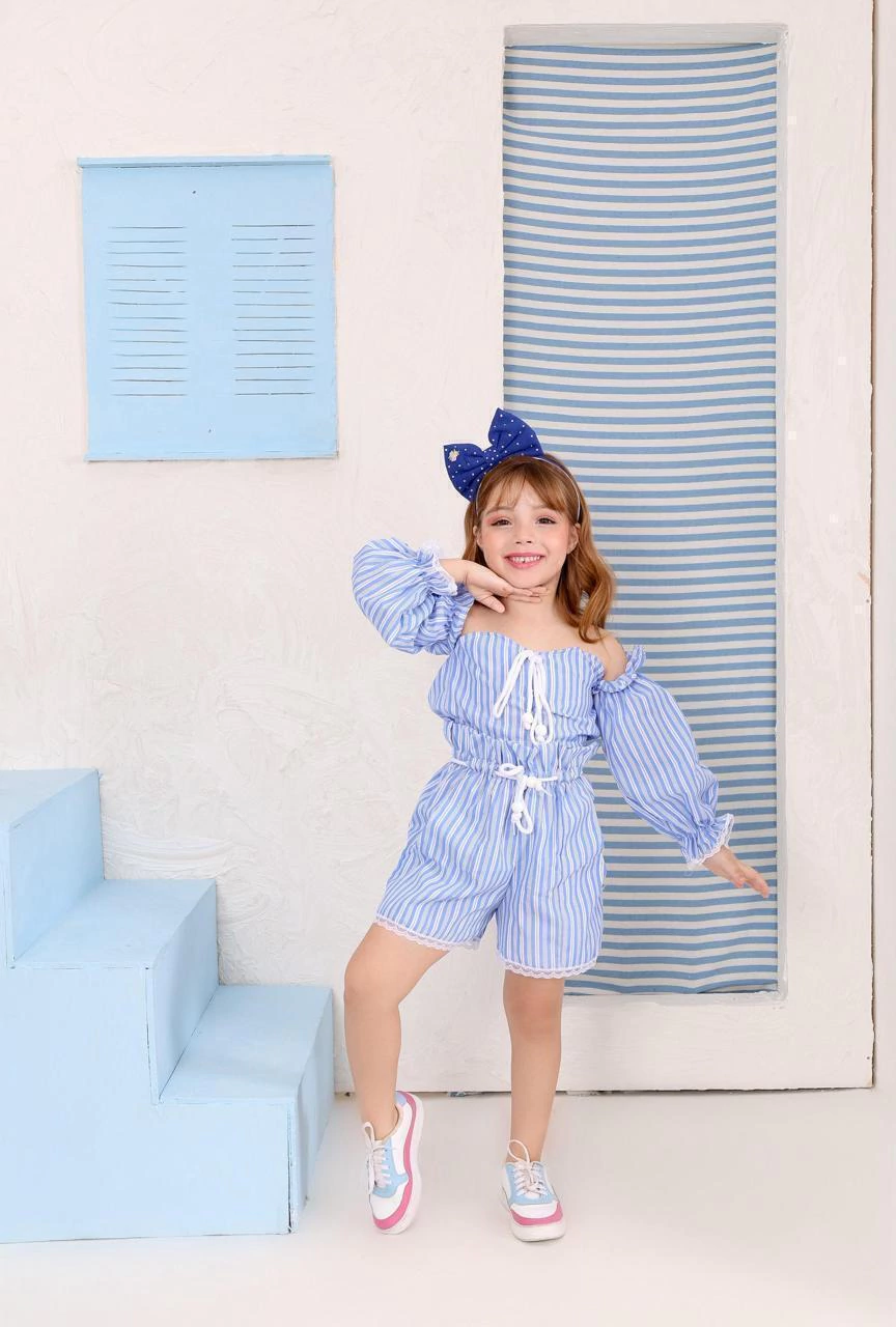 O Conjunto Infantil Gabriela Listrado Azul é a escolha perfeita para os dias quentes de verão! Composto por short leve e cropped moderno, ele une conforto e estilo em uma peça única. As listras em azul trazem um charme especial, deixando o look ainda mais delicado e alegre para meninas que amam se vestir bem.