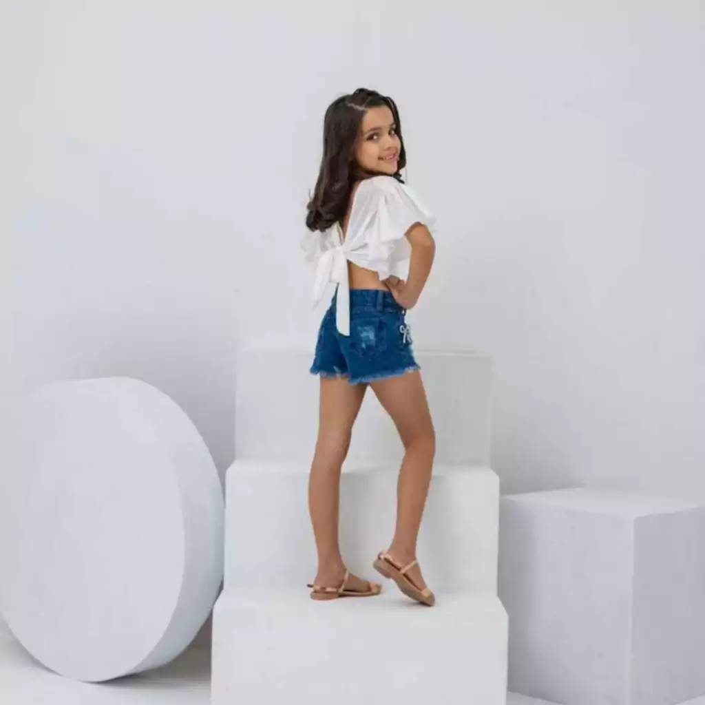 Esse short infantil jeans é a escolha perfeita para as meninas que adoram estar na moda durante o verão! Com um design desfiado moderno e uma aplicação delicada de laço, ele une estilo e fofura em uma única peça. Ideal para crianças que gostam de se destacar com um visual estiloso e cheio de personalidade.
